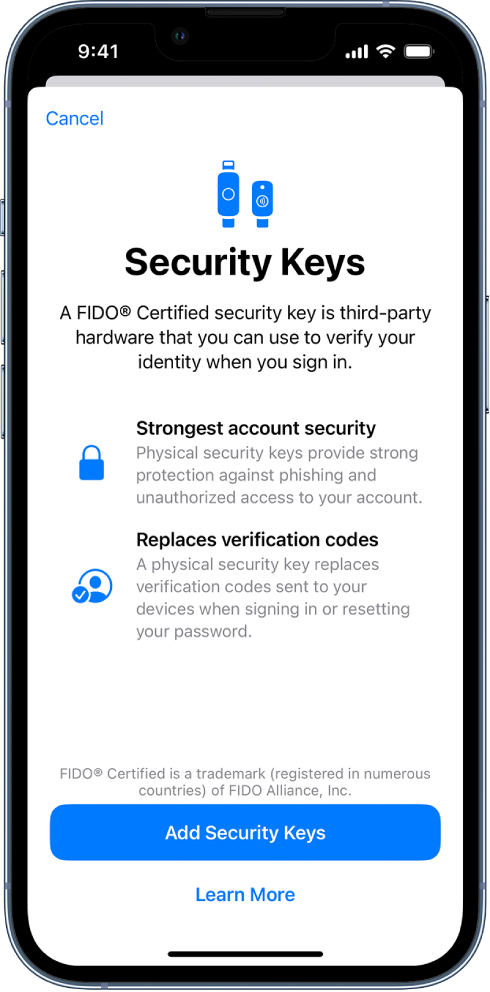 - Tap Add Security Keys, then follow the onscreen instructions to add your keys
