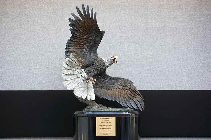 The U.S. national symbol, the eagle, represents vigilance, alertness, strength, courage, and freedom. Located in the lobby, the dramatic 48-inch bronze “Windwalker” by sculptor Kitty Cantrell exemplifies the same qualities. It was added to the collection on April 1, 2002.